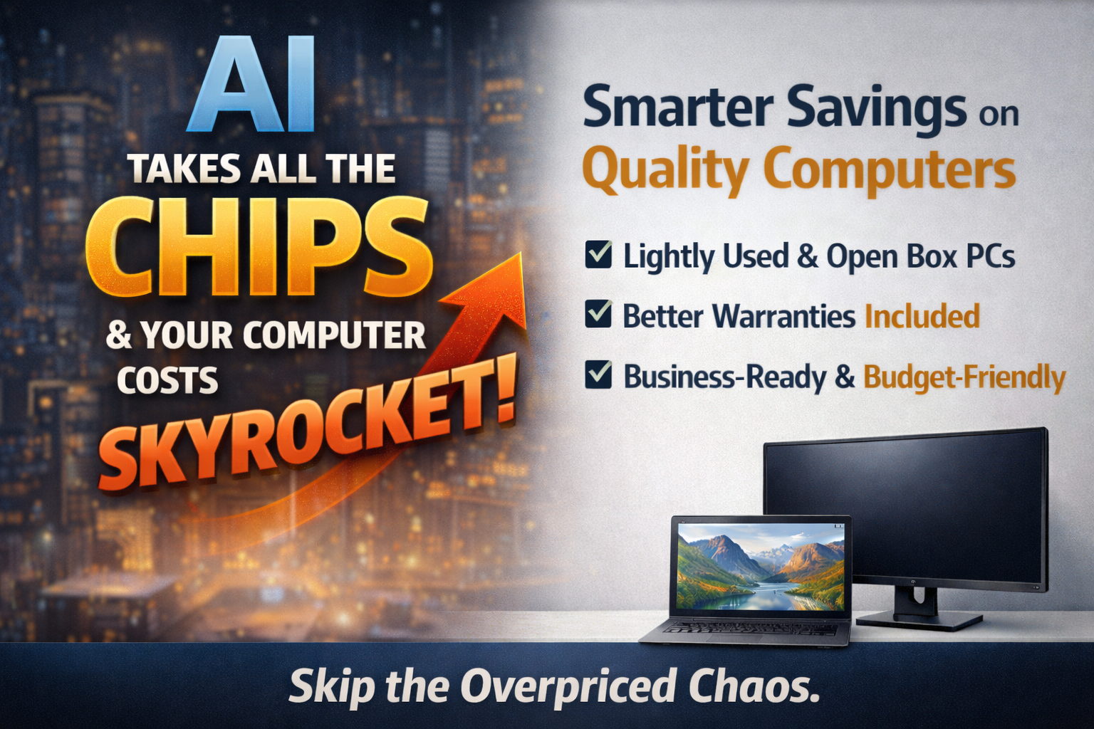 If you have tried to buy a new computer lately and felt personally attacked by the price tag, you are not imagining things. AI is hungry. And it is eating all the chips. If you haven't noticed this yet, you will. Artificial intelligence systems and data centers rely on high performance processors. The same chips that power business laptops desktops and servers are now being scooped up in massive quantities by AI companies and data centers. When demand explodes and supply stays tight, prices do exactly what you would expect. They skyrocket . Manufacturers prioritize bulk buyers. Supply chains tighten. Retail prices climb. Suddenly a basic business computer costs hundreds more than it did a year ago or even a week ago like it did for me at the time of writing this and delivers little to no improvement for everyday work. Small and mid-sized businesses feel this the hardest. You need reliable machines to run your business. You do not need to fund the AI arms race. Why New Computers Are Getting More Expensive This is not just inflation. It is a perfect storm. AI workloads require powerful CPUs GPUs and memory Chip manufacturers are focusing on high margin AI hardware Every available component is under increased demand That demand drives up costs across the entire market Even standard office computers are affected. You end up paying premium prices for hardware you do not actually need. Our Solution Smarter Hardware Without the Sticker Shock We saw this coming. So we built a smarter option for our customers. We provide lightly used and open box computers that deliver real world performance at a fraction of the cost. These are business grade systems not mystery machines pulled from a closet. Every device is carefully vetted tested and configured by our team. Here is the part most people do not expect. They come with better warranties . Yes, REALLY . Because we stand behind the hardware we deploy. Our warranties are designed for business use not consumer headaches. If something fails you are not stuck arguing with a call center or waiting weeks for a replacement. Why This Actually Makes Sense for Your Business You save money upfront You avoid inflated AI driven pricing You get enterprise quality hardware You get stronger warranty coverage You keep your business running smoothly Most businesses do not need the latest bleeding edge hardware. They need dependable systems that work every day without drama. ๏ปฟ That is exactly what we deliver. AI Can Have the Chips. You Can Have the Savings AI is not slowing down. Chip shortages and pricing pressure are not going away anytime soon. But that does not mean your business has to overpay for computers. We help our customers sidestep the chaos with smart hardware choices that protect both performance and budget. If you are tired of outrageous computer prices and want a practical alternative that actually works, let us talk. AI can fight over the chips. We will make sure your business still wins.