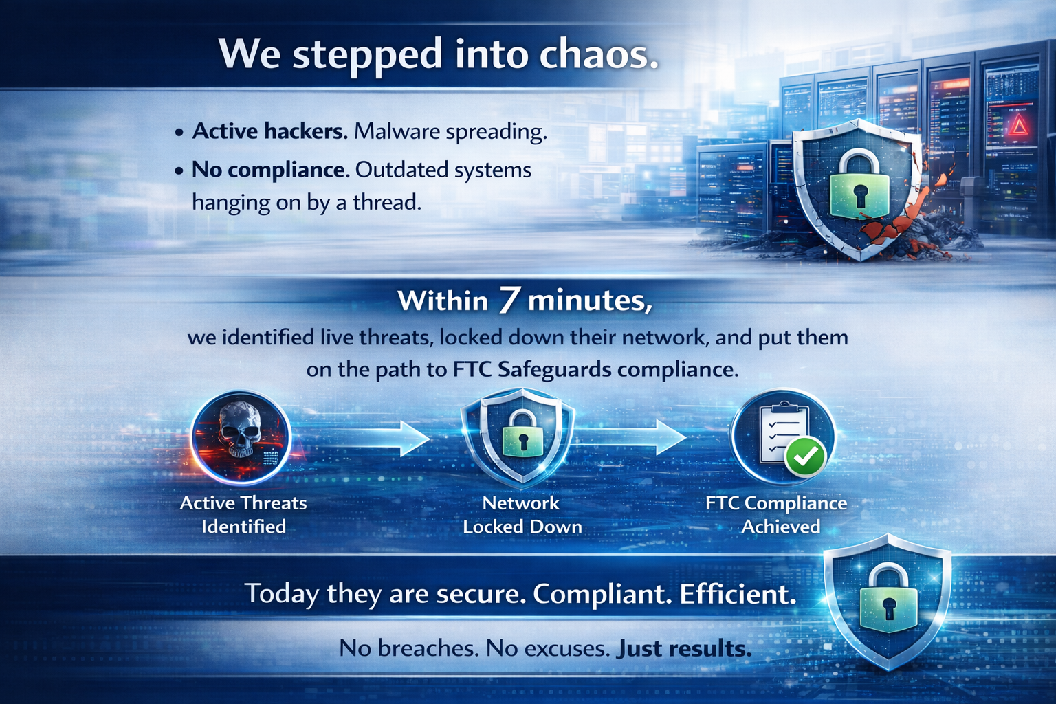 Within seven minutes, we identified live threats, locked down their network, and put them on the path to FTC Safeguards compliance. From there, we optimized their environment and cut their technology costs in half.