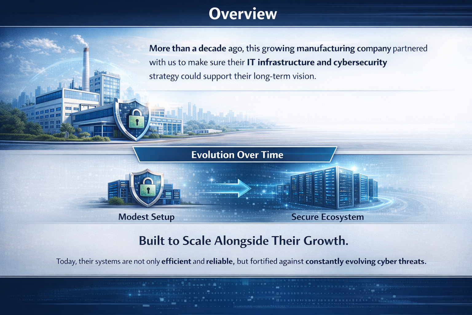 More than a decade ago, this growing manufacturing company partnered with us to make sure their IT infrastructure and cybersecurity strategy could support their long term vision. What started as a modest environment has evolved into a powerful, secure ecosystem built to scale alongside their growth.