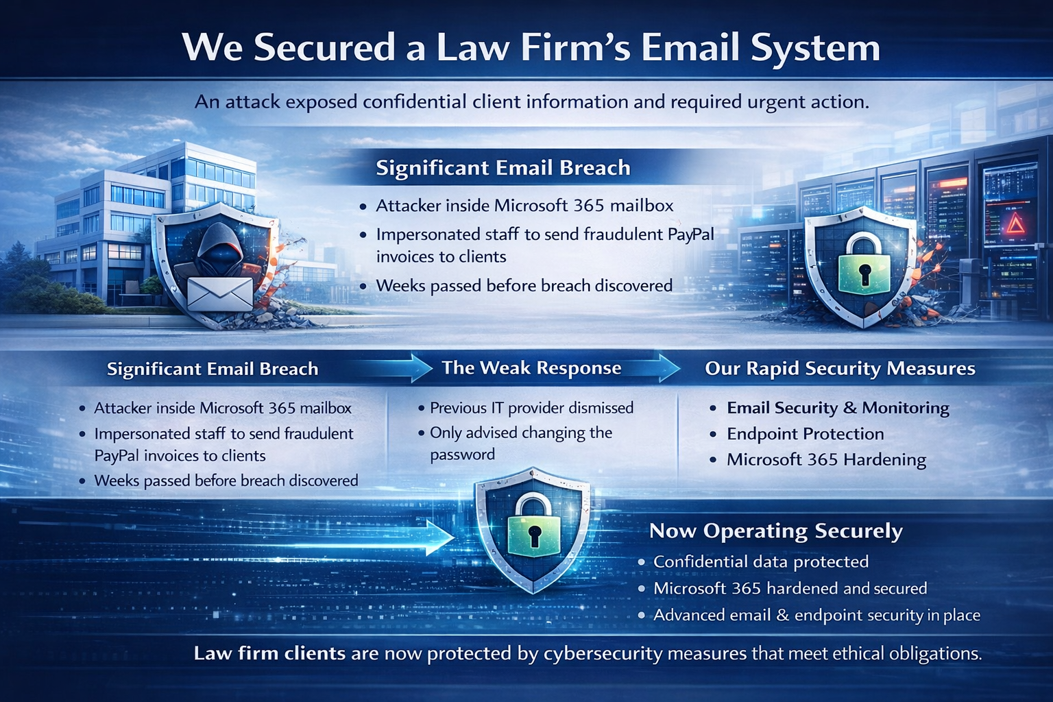When this law firm discovered that an attacker had been inside a Microsoft 365 mailbox impersonating staff and communicating with clients, they realized their previous IT support was not equipped to handle serious security threats. What was initially dismissed as a simple password issue turned out to be a significant breach with potential exposure of confidential legal information.